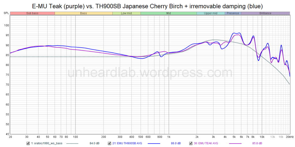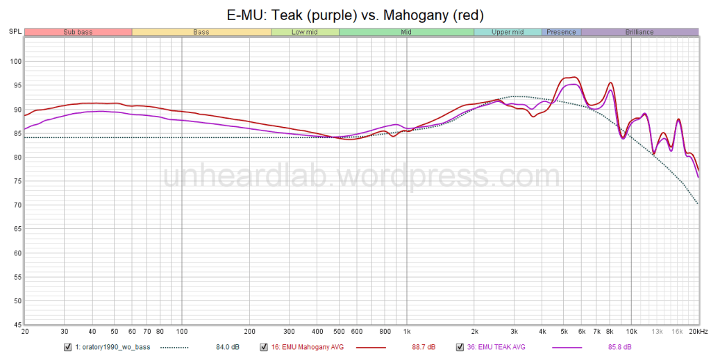 Let’s start with mahogany, the softest wood. Bass region as a whole is lifted by about 2-3db. Tonality is defintely warmer, although there’s also a slight boost of about 1-2db around 5-7khz. In the mids there’s some give and take so overall the mahogany cups make these noticeably warmer and V-shaped than Teak.