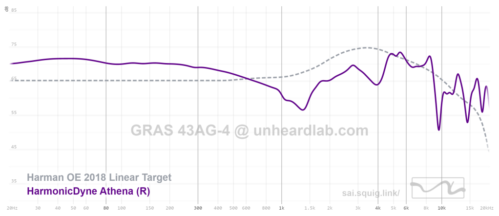 Admittedly, one could argue that the FR curve showcased in the ad is simply a depiction of how HarmonidDyne generally tunes their headphones (in other words, their tuning target), not a specific measurement of the Athena model’s actual FR. I don’t mean to suggest that this is intentionally misleading, but it has the potential to confuse consumers, especially given that the name ‘Athena’ is featured prominently in the centre of the image.