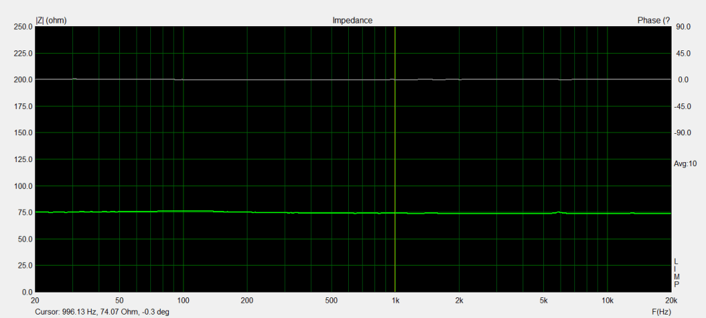 The above graph shows the measured impedance (green) and electric phase (grey).
