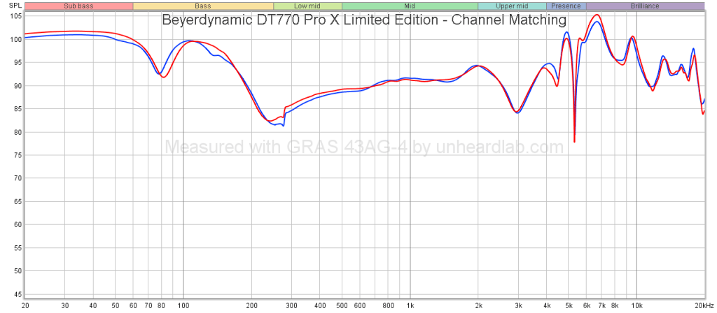 Channel matching graphs do not relate to the perceived sound profile. A specialised configuration is used in this test to capture differences between channels, mitigating interference from positioning on the rig and the asymmetry in the GRAS pinnae design, a legacy of KEMAR. The left (blue) and right (red) channels are measured using a flat plate coupler with an IEC60318-4 ear simulator.