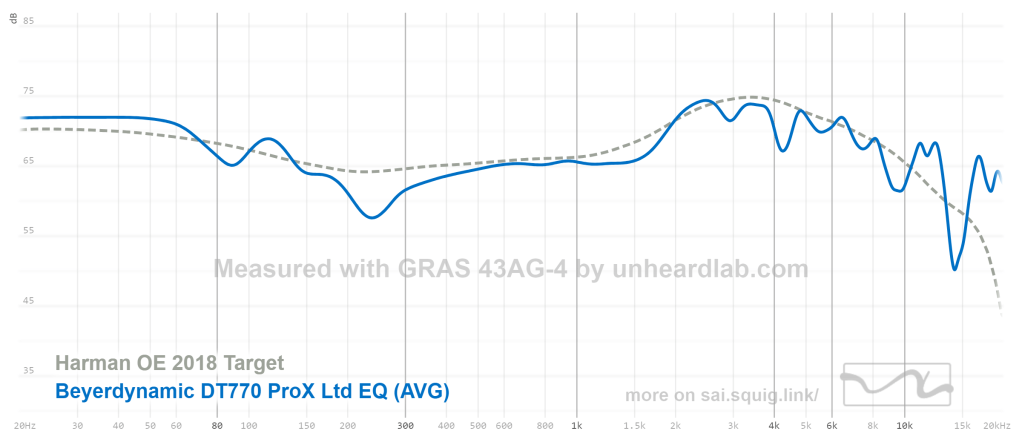 The Treble is sharp, and can sometimes sound harsh and unrefined. Instruments like violins and cymbals are particularly highlighted thanks to a boost between 5-12kHz. Above that, the sense of airiness is moderate, less damped than the DT700 but not as clear as the original DT770. Sibilant tones are accentuated, but they do not ‘stick out’ overly, likely due to the broad nature of the treble rise (instead of having sharp, narrow peaks). Nevertheless, a more linear treble response would be preferable, unless you’re specifically seeking this kind of colouration.