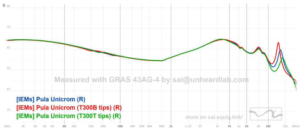 The graph illustrates how this earphone behaves with wide-bore (Tanchjim T300T) and narrow-bore (T300B) tips.