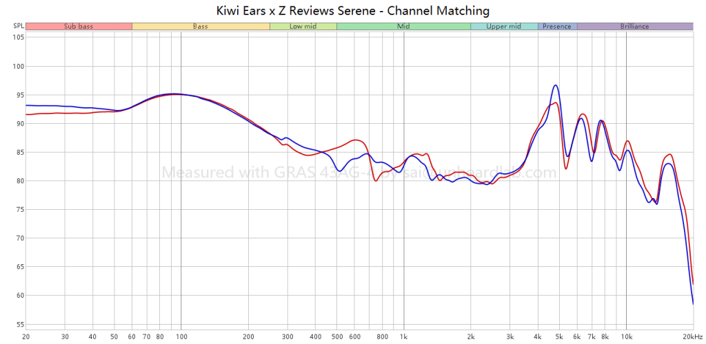 Channel matching graphs are intended for quality control checks and do not relate to the perceived sound profile. A specialised configuration is used in this test to capture differences between channels, mitigating interference from positioning on the rig and the asymmetry in the GRAS pinnae design, a legacy of KEMAR. The left (blue) and right (red) channels are measured using a flat plate coupler with an IEC60318-4 ear simulator.