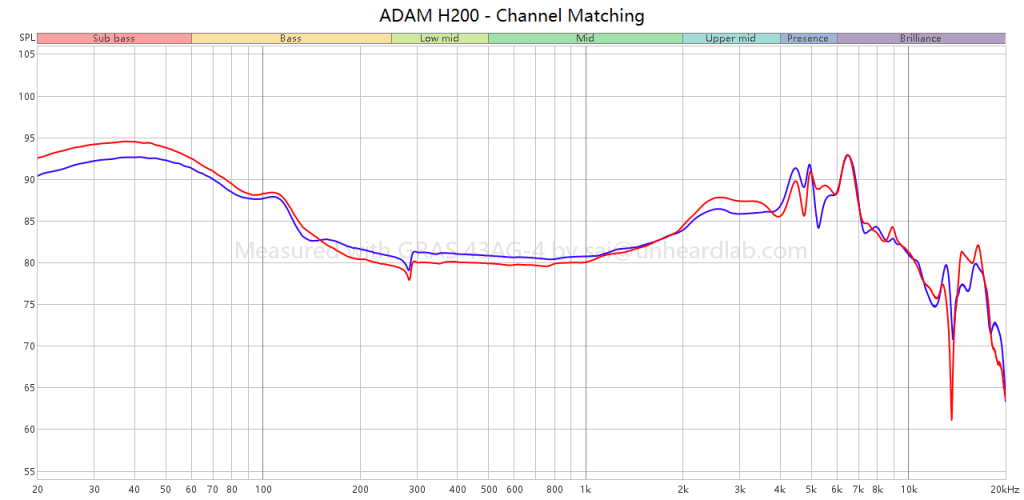 Channel matching graphs are intended for quality control checks and do not relate to the perceived sound profile. A specialised configuration is used in this test to capture differences between channels, mitigating interference from positioning on the rig and the asymmetry in the GRAS pinnae design, a legacy of KEMAR. The left (blue) and right (red) channels are measured using a flat plate coupler with an IEC60318-4 ear simulator.