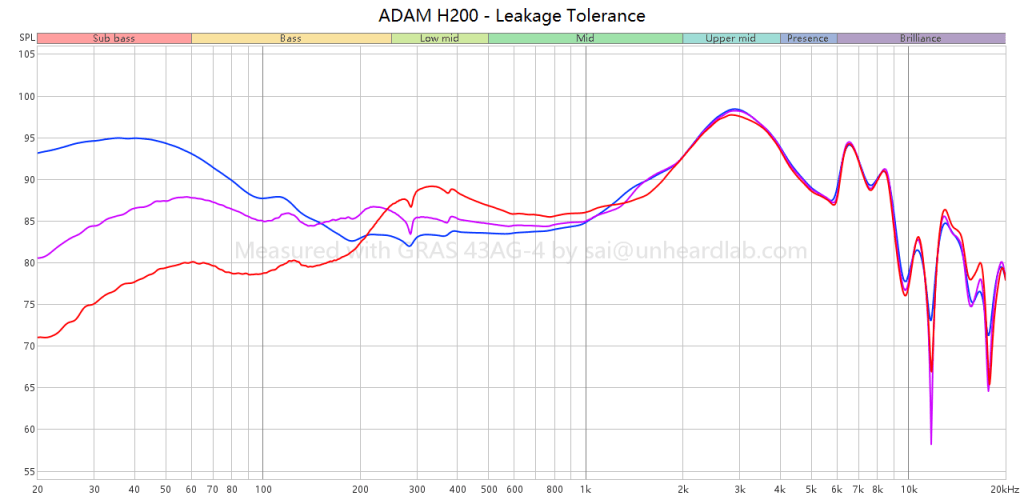 This graph demonstrates how leakages to the front volume can result in FR change: blue (good seal), purple (thin arm glasses), red (thick arm glasses). The FRs shown on the graph is 1/12 octave smoothed.