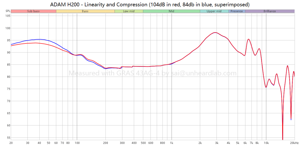 Linearity and dynamic compression testing plots the headphone’s frequency response at two input levels to show how it reproduces signals as loudness changes. Any divergence between the high-level and low-level curves points to where the transducer’s dynamic range begins to compress or distort. Here, the measurements are superimposed to allow direct comparison. The FRs shown on the graph is 1/6 octave smoothed.