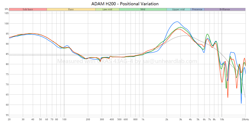 This graph illustrates how headphone placement on the head affects perceived tonal balance: with the ear positioned at the front (blue), centre (green), and back (red) of the headphone. The FRs shown on the graph are 1/48 octave smoothed.